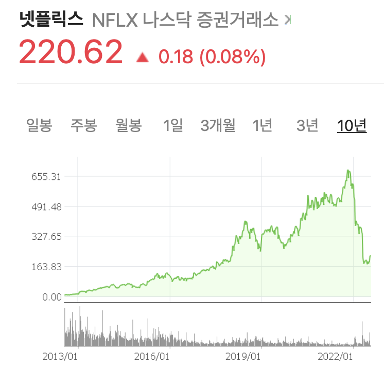 OTT 업계의 압도적인 시장점유율로 "전 세계 온라인 동영상 서비스 시장에서 경쟁 상대가 없다"는 평을 듣던 넷플릭스는 높은 물가상승률로 인한 실질소득이 감소한 소비자들이 비필수 소비재인 구독 서비스를 해지하기 시작하자 올해 1분기, 2분기 모두 구독자가 감소하며 주가가 롤러코스터를 탄 것처럼 급락한 상태입니다.