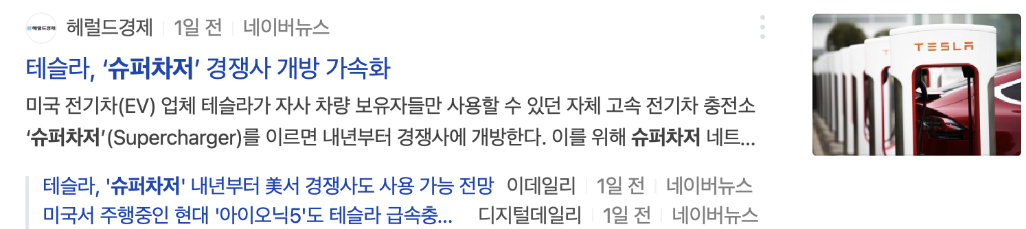 오늘은 전기차 업체인 테슬라와 관련된 소식을 가져왔습니다. 테슬라가 자사 차량 보유자만 사용할 수 있던 자체 고속 전기차 충전소인 슈퍼차저를 이르면 내년부터 경쟁사에 개방한다고 합니다.