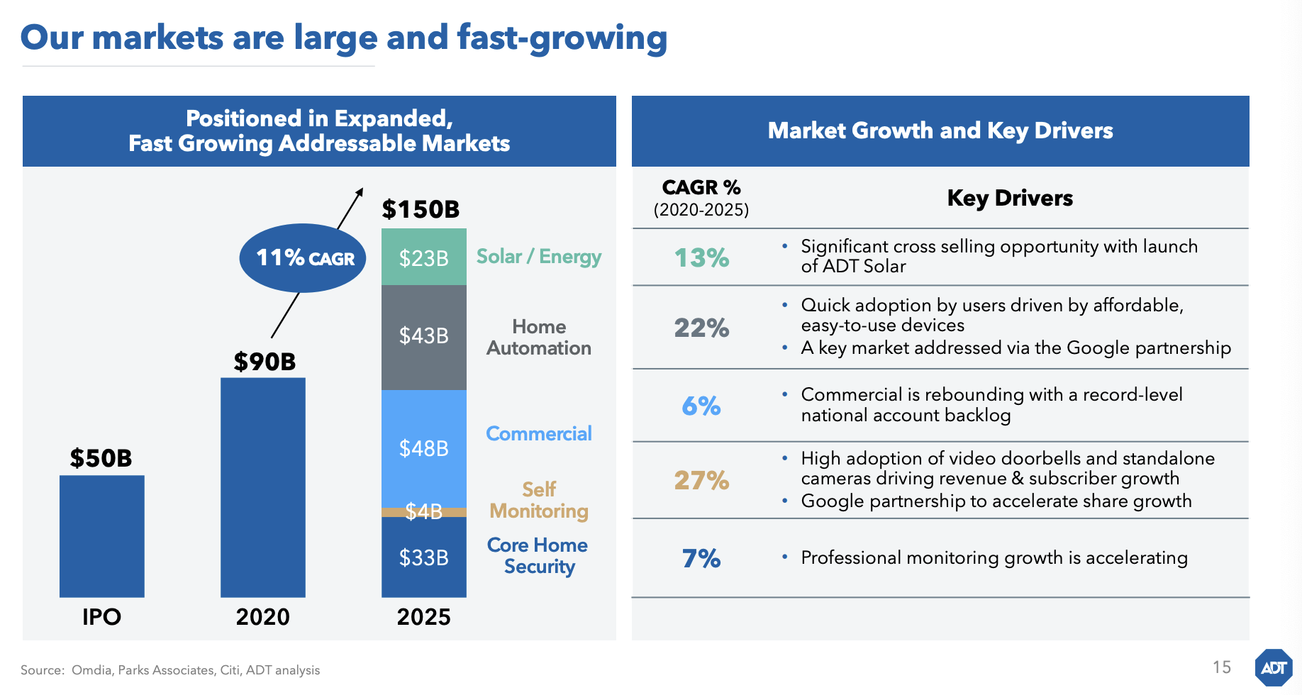 이처럼 빈부격차, 전염병으로 인한 지역 공동체의 약화 등이 겹치며 미국의 범죄율은 증가하는 추세입니다. 치안이 나빠지면 수혜를 입는 산업 중에 하나가 바로 보안 산업이죠. ADT는 연평균 11%씩 시장이 성장할 것이라고 전망합니다.