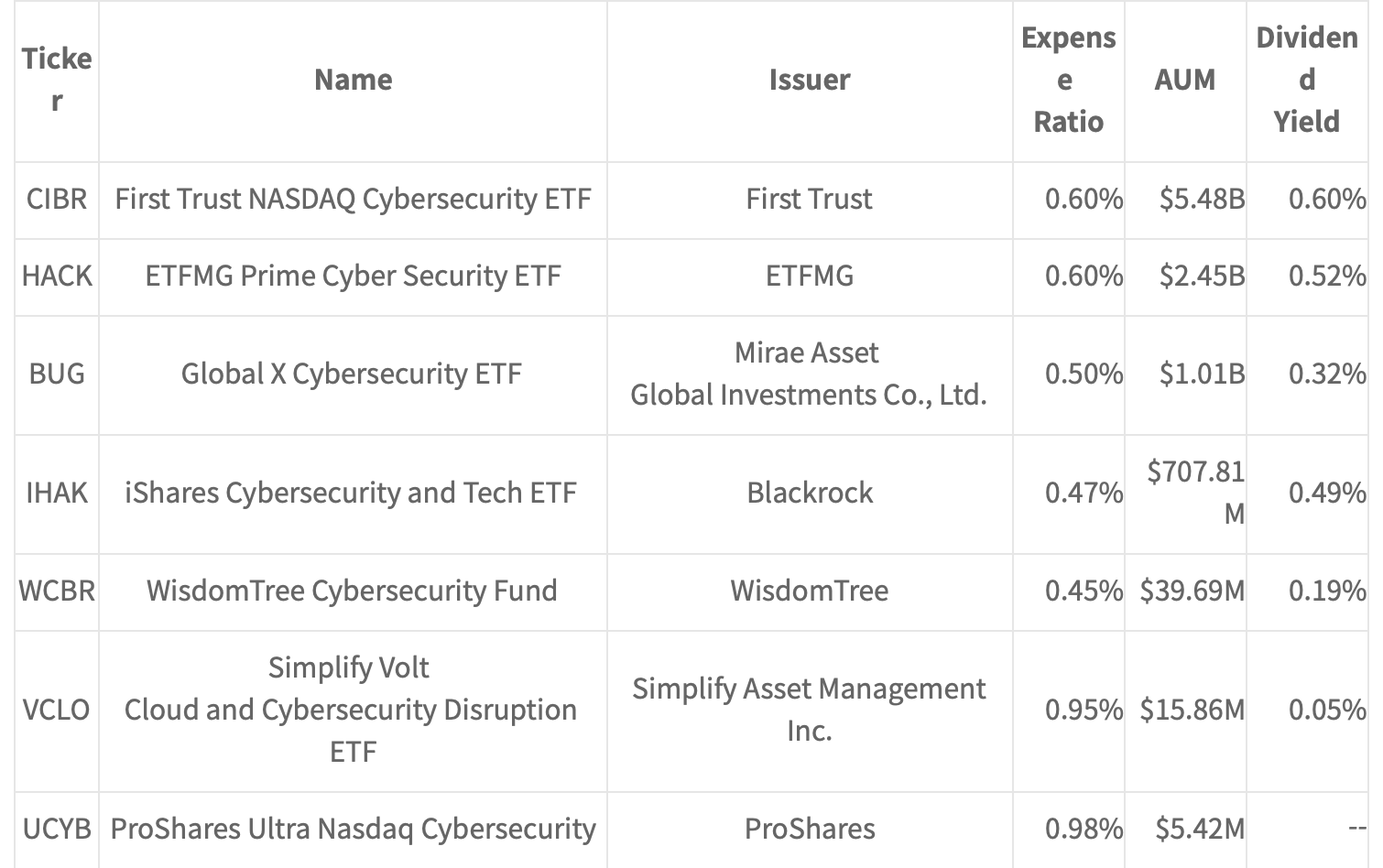 사이버보안 기업들을 모아둔 ETF 7가지를 정리해 두었으니 관심있으신 분은 아래 표 참조하시면 될 것 같습니다.