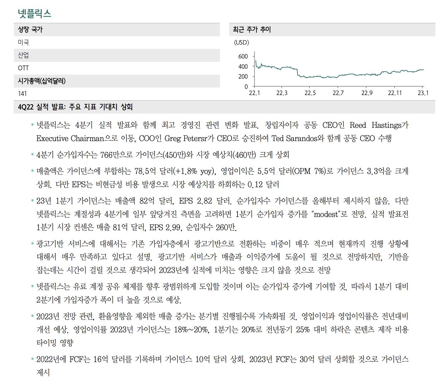 단, EPS는 회사채 평가손실에 따른 비현금성 비용(유로화로 발행한 회사채가 달러 대비 유로화 강세로 인해 부담해야 할 이자비용이 증가하며 회사채 평가손실 발생)이 크게 증가하며 예상치를 하회하는 0.12달러를 기록했습니다. 23년 1분기 가이더스로는 매출액 82억 달러와 EPS 2.82달러로 전 분기 대비 매출액과 주당순이익 모두 성장하는 반면, 순가입자(신규 가입자-구독 해지 수)는 증가하지 않을 것이란 분석을 내놓았습니다.