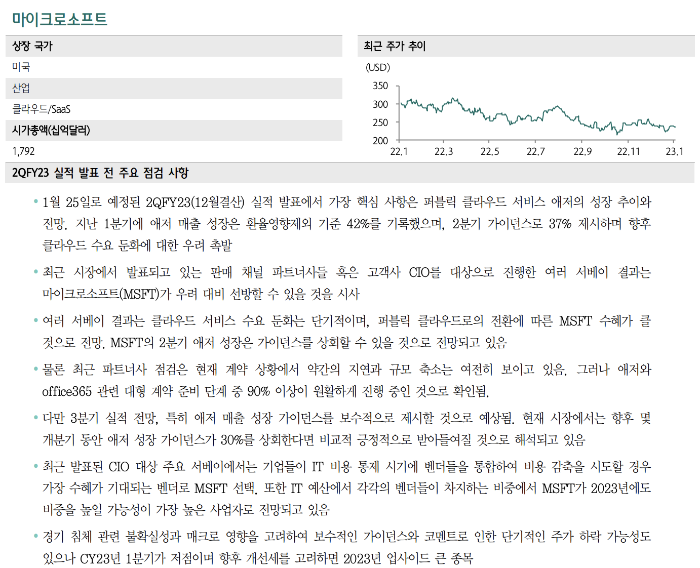 최근 발표된 CIO(Chief Information Officer, 최고 정보 책임자)를 대상으로 한 주요 설문조사에 의하면 기업들이 경기침체 우려로 IT 관련 지출을 축소할 경우 가장 수혜가 기대되는 사업자로 마이크로소프트를 선택했습니다. 또한, 기업들이 계속해서 자체 서버(전산실)을 운영하는 것에서 퍼블릭 클라우드로 업무 인프라를 전환함에 따라 마소의 실적은 장기적인 관점에서 지속 성장할 것이라는 전망이 지배적입니다.