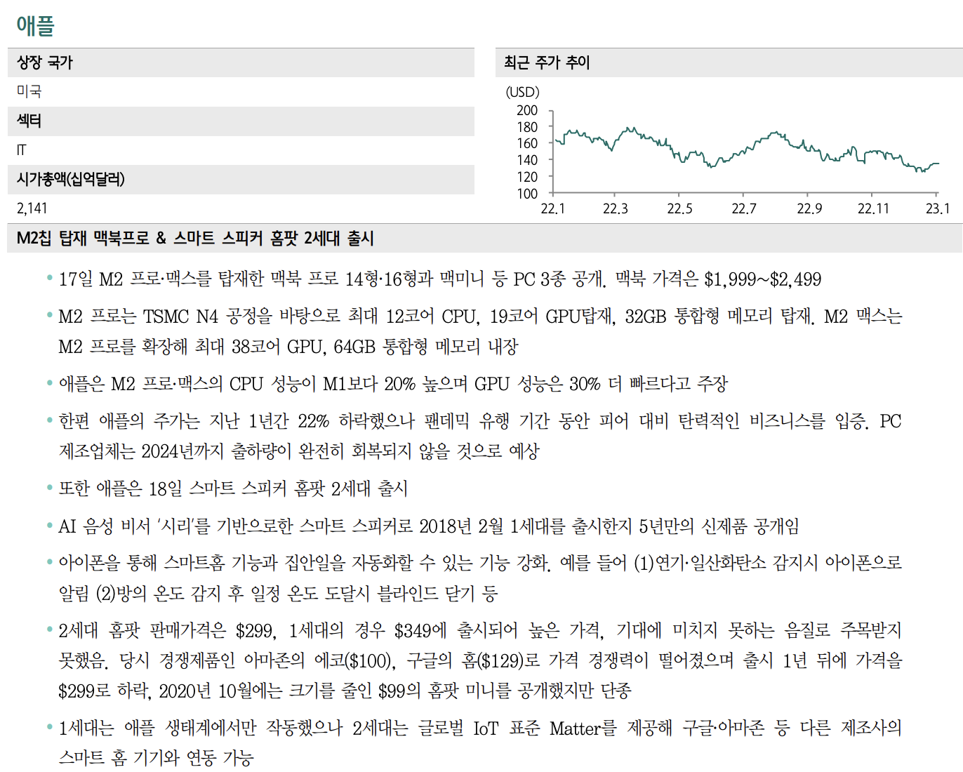 최근 다량의 신제품(자체 설계 칩셋인 M2를 탑재한 맥북, 맥미니, 홈팟2)을 공개한 애플의 가장 큰 변화는 IOT 디바이스에 눈독을 들이고 있다는 것입니다. 2018년에도 Siri를 탑재한 스마트 스피커인 홈팟 1세대를 출시한 전적이 있지만 높은 판매가격과 애플 디바이스만 연결이 가능한 폐쇄성으로 인해 판매량이 저조했었습니다. 이에 절치부심한 애플이 새롭게 선보인 홈팟 2세대는 전작 대비 판매가격을 50 달러 낮췄고, 글로벌 IOT 표준인 Matter를 지원해 다른 기업의 스마트 홈 기기와 연동이 가능합니다.
