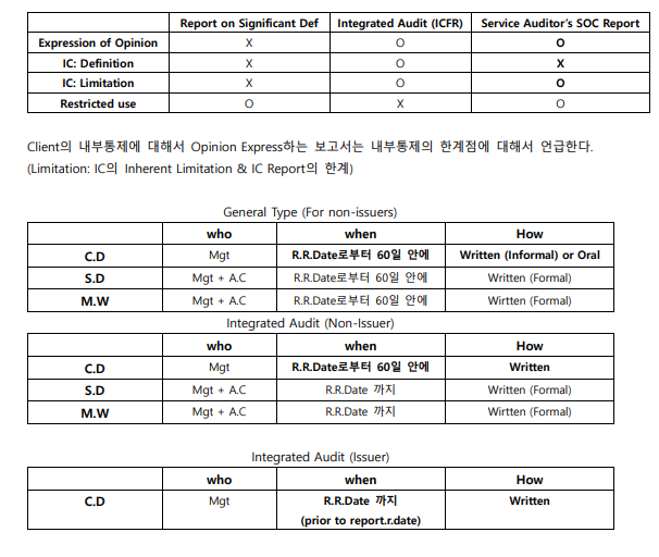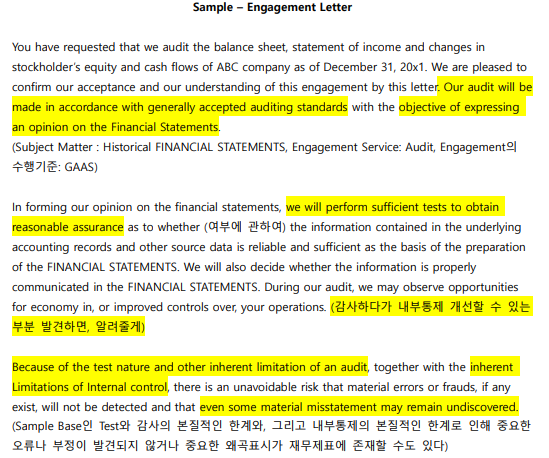 예를 들어서, A.U.P Report에는 "내가 다른 절차를 수행해서 알게 되는 finding은 전부 report 하였다" 와 같이 보고서마다 특징적인 문장들이 있습니다. 이런 문장들을 꼼꼼히 암기하는 것이 필요합니다.