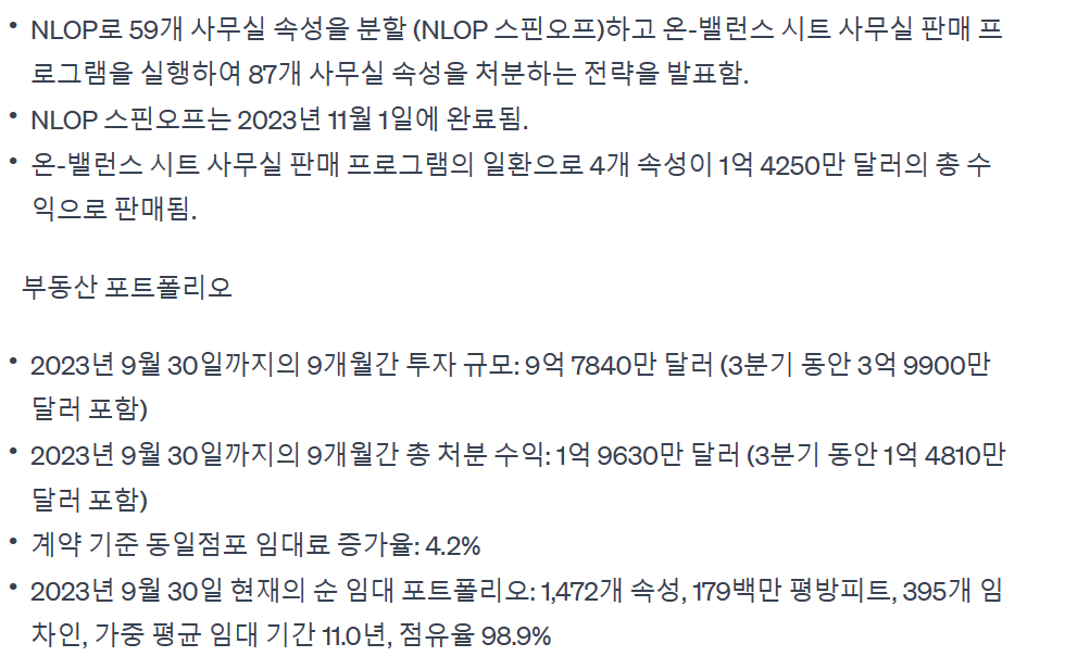 - 2023년 3분기 AFFO는 주당 1.32달러로 하락, 2024년 AFFO 예상 범위는 4.60달러에서 4.80달러.(24년: 분기당 1.2달러 수준의 AFFO 전망, 오피스 자산 매각 및 분사에 따른 AFFO 하락)
