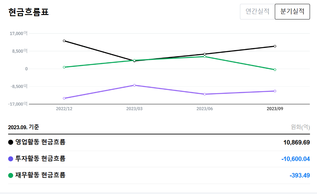2022년까지 매출및 영업활동 현금흐름은 증가하는 추세였으나 23년 1분기부터 영업현금흐름이 감소하기 시작했습니다.