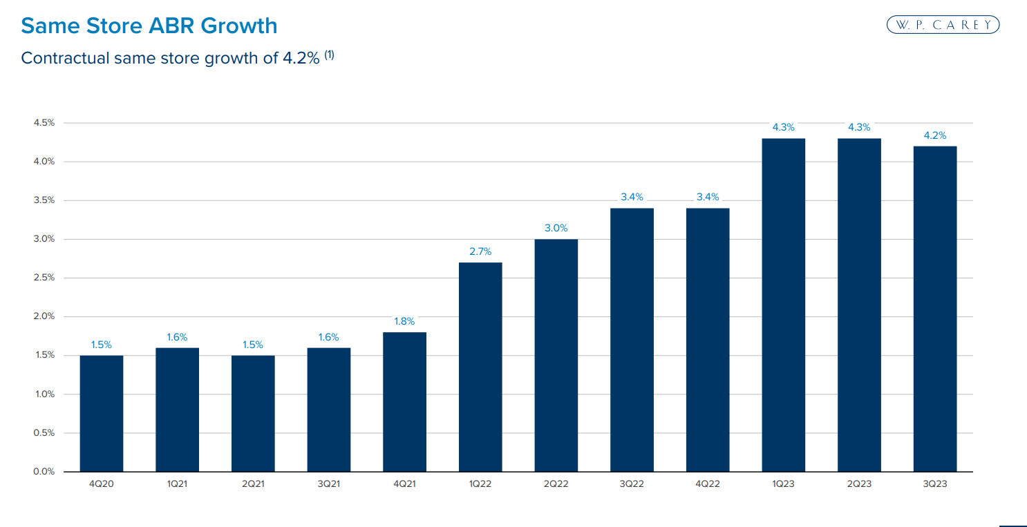 23년 3분기 기준 동 리츠의 부동산 포트폴리오에서 '동일점포 임대료 증가율'을 보면, 전 기간 대비 4% 이상 증가한 것을 알 수 있습니다. 임대료가 증가한 이유는 임대 계약의 52%가 CPI (물가지수)에 연동되어 있기 때문에, 부동산 자산이 위치한 지역의 물가지수가 오를 경우에 임대료도 자동으로 증액되도록 구성했기 때문입니다.