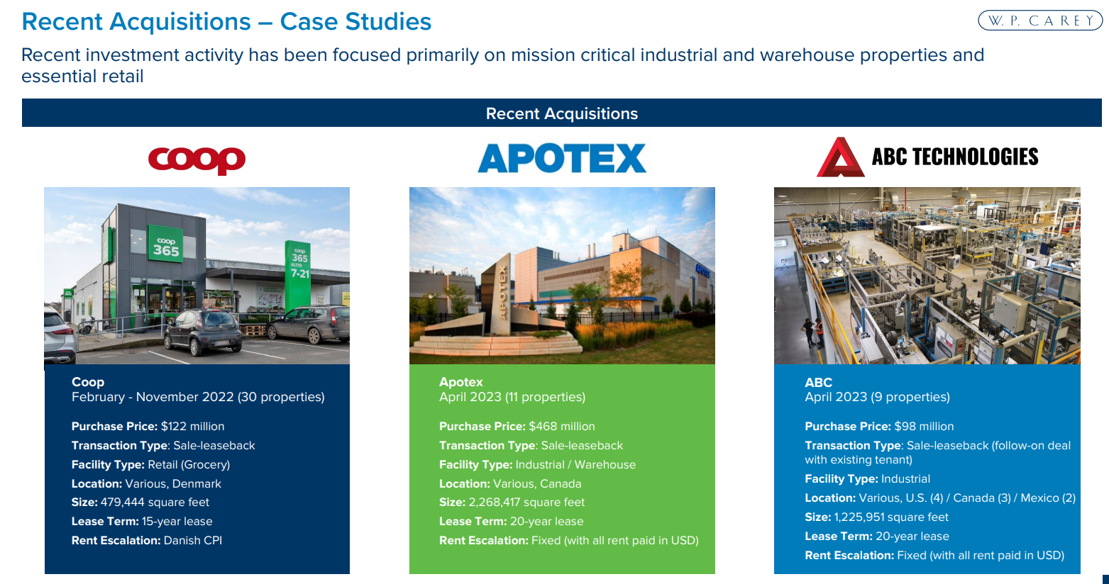 W. P. Carey는 2023년에 약 13억 달러 규모의 투자를 발표했습니다. 이는 주로 높은 품질의 단일 세입자 창고와 산업 자산에 중점을 둔 것으로 나타났습니다. 특히, 4분기에는 이탈리아, 스페인 및 독일에서 Fedrigoni Group에게 세일리즈백된 11개 시설에 대한 3.2억 달러의 투자가 포함되었습니다. CEO인 Jason Fox는 판매자들의 가격 기대와의 조율에 노력하여 2023년에 가격 힘을 행사하여 스프레드를 보존했습니다. 지역적으로는 80%가 북미에, 20%가 유럽에 투자되었습니다. 이로써 2023년 투자 규모는 13억 달러가 되었으며, 1월에 약 1억 8000만 달러 규모의 추가 투자가 예정되어 있습니다.