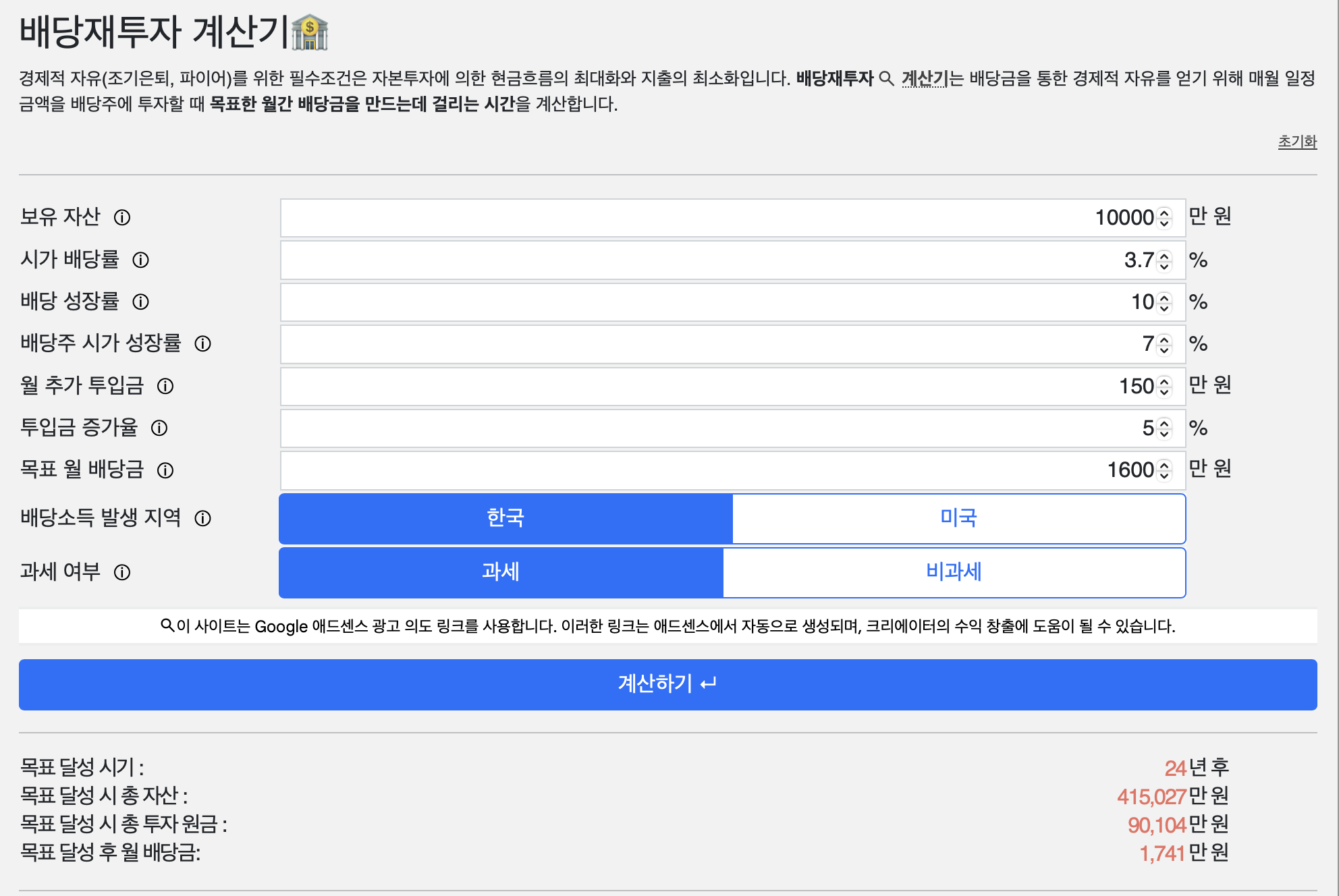 '샐러리버프'라는 사이트의 배당재투자 계산기를 사용해 1,600만원의 수입을 만들기 위해 필요한 기간을 계산해 봤습니다.