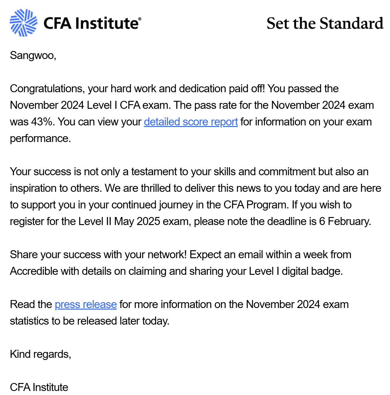 CFA lv.1 합격 후기로 돌아왔습니다. 24년 11월에 응시했는데 2달이 지난 1월 14일에야 시험 결과가 발표됐네요.
