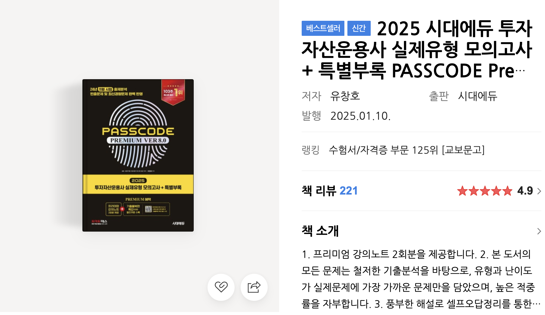 2025 시대에듀 투자자산운용사 실제유형 모의고사 + 특별부록 PASSCODE Premium ver 8.0 : 네이버 도서