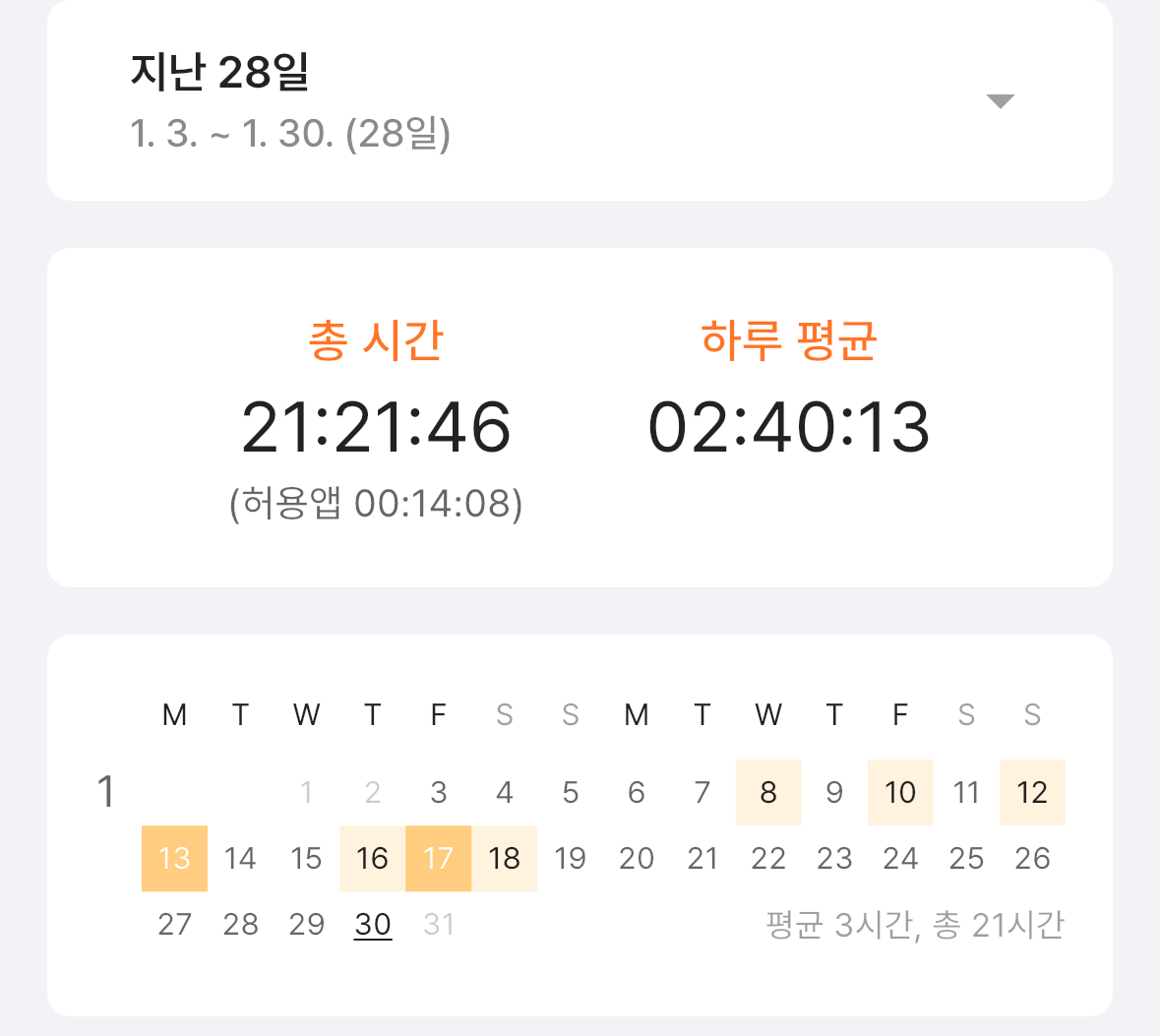 방금 열품타를 확인해보니 1월 8일부터 공부를 시작했네요. 8일부터 19일까지 총 7일 가량 투운사 시험을 준비했고, 합격에 걸린 시간은 총 21시간입니다.