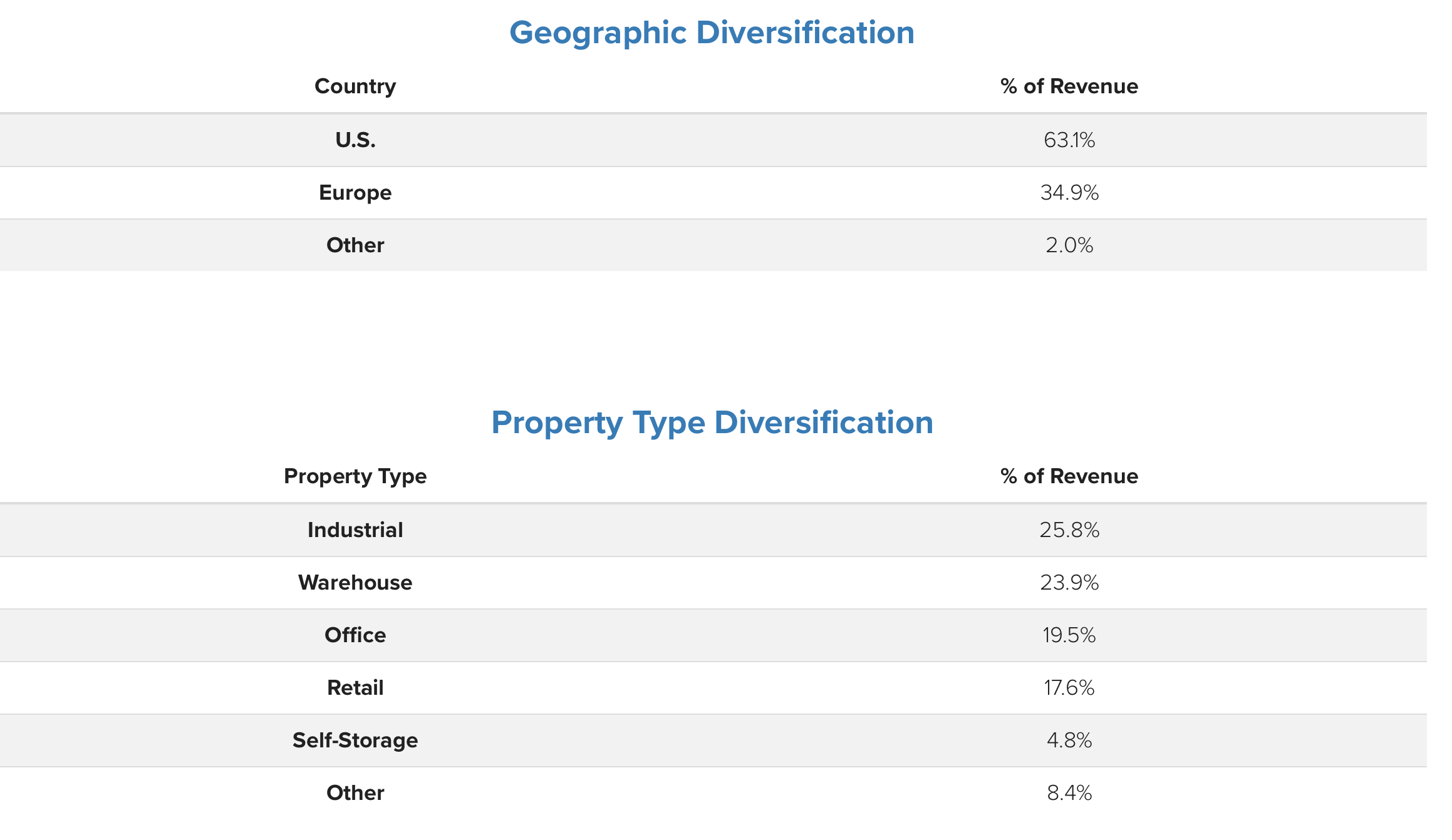 이렇게 부동산을 섹터별로 다양하게 보유하는 것이 좋은 이유는 경기 불황이나 공급망 문제, 특정 지역의 경제 이슈 등 여러 경제 위기에 한 섹터가 영향을 받더라도 영향을 덜 받은 섹터에서 나오는 임대수입으로 인해 주주에게 안정적으로 배당금을 지급할 수 있기 때문입니다.