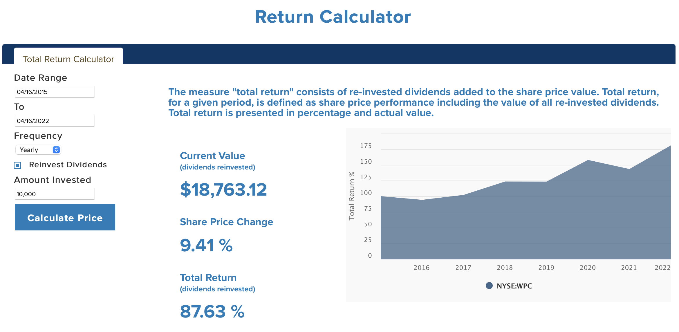 2015년부터 2022년 4월까지 초기에 10,000달러를 투자하고 수령한 배당금을 전액 재투자하였다면 6년 동안 해당 기업의 주식을 보유한 것에 대한 대가로 Total Return은 87.63%를 기록하였습니다.