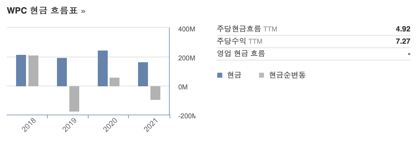반대로 투자활동 현금흐름은 큰 폭으로 증가하였는데, 이는 WP 케어리가 2021년에 큰 규모로 부동산을 취득하였다는 것으로 해석되는데요, 기준금리 인상과 함께 다른 리츠 기업들이 신규 부동산 매입을 꺼리는 상황에서도 WP 케어리는 탄탄한 현금흐름을 바탕으로 지속적으로 신규 부동산을 취득하는 것으로 보입니다. 이 부분은 향후 동사가 다른 리츠주와 차별되는 포인트가 될 것 같습니다.