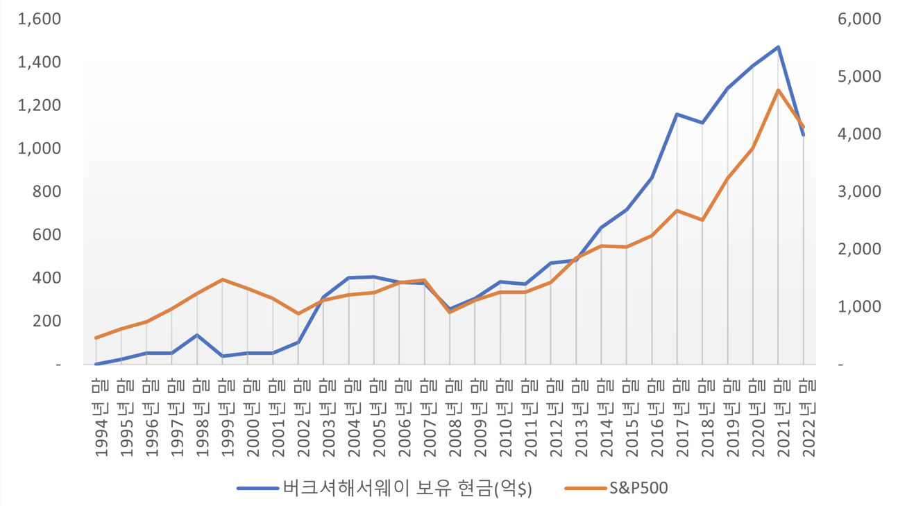 2010년대, 그리고 2020년 코로나 팬데믹 이후 계속해서 이어진 미국 증시 강세장 속에서도 버크셔해서웨이는 총 자산에서 현금이 차지하는 비중을 계속해서 늘려왔습니다. 2008년 말 250억 달러 수준이던 현금이 2021년 말에는 1,470억 달러 가까이 상승하며 미국 기업 가운데 보유한 현금이 가장 많은 기업 2위에 랭크되기도 했습니다. (1위는 애플, 3위는 MS였습니다)