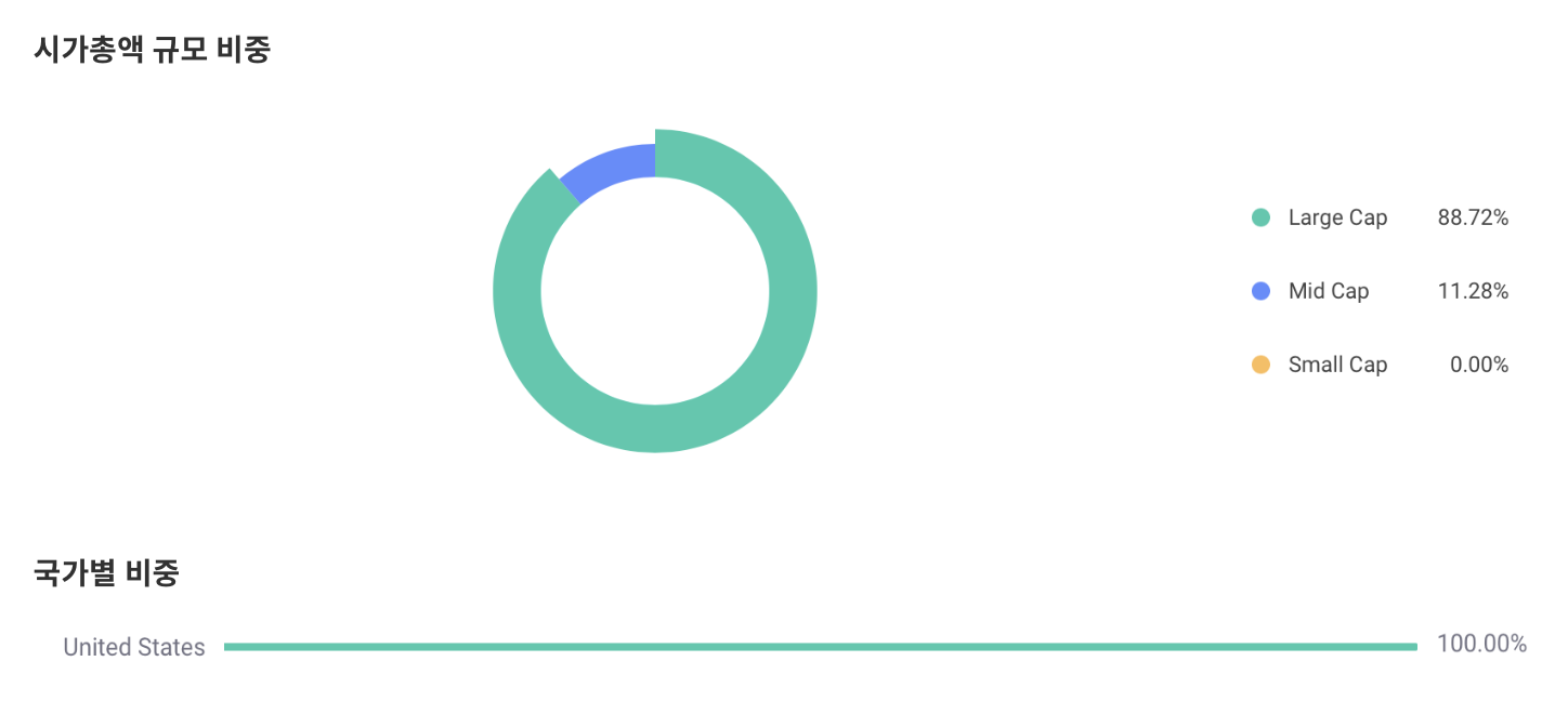시가총액이 $50억 달러 이상인 라지캡의 비중이 88.72%, 시가총액이 $10억-$50억 달러 미만인 미드캡의 비중이 11.28%를 차지하고 있고, 시가총액이 $10억 미만인 스몰캡은 전혀 담고 있지 않다는 점이 특징적입니다.