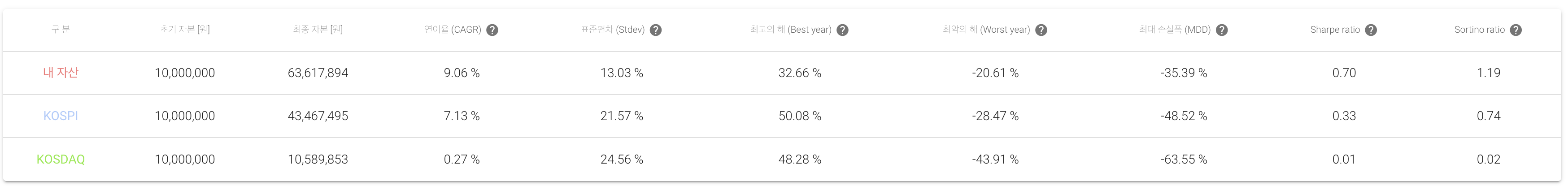 만약 1,000만원을 2001년에 XLV에 투자하고 배당금을 재투자하여 지금까지 보유했다면 1,000만원은 63,617,894원으로 불어났을 것입니다. 코스피에 투자하는 것도 훌륭한 전략이었겠지만 XLV는 최대손실폭 즉, MDD가 -35.39%로 코스피 -48.52%에 비해 낮고, 연환산수익률(CAGR)이 9%로 코스피에 비해 2% 가량 높습니다.