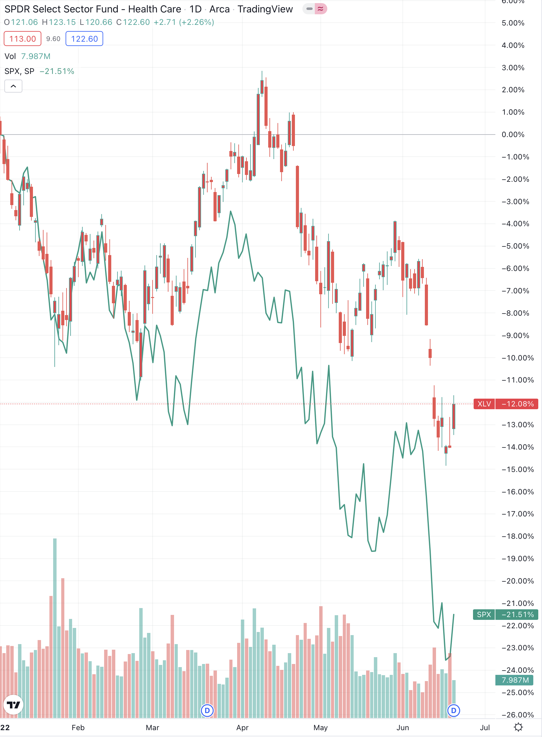 인플레이션, 금리인상, 경기침체 우려, 전쟁 이슈 등 수많은 외부변수로 S&P500이 지난 1년간(YTD) -21.51% 하락했지만 XLV는 -12.08% 정도만 하락하며 방어력이 우수함을 입증했습니다.