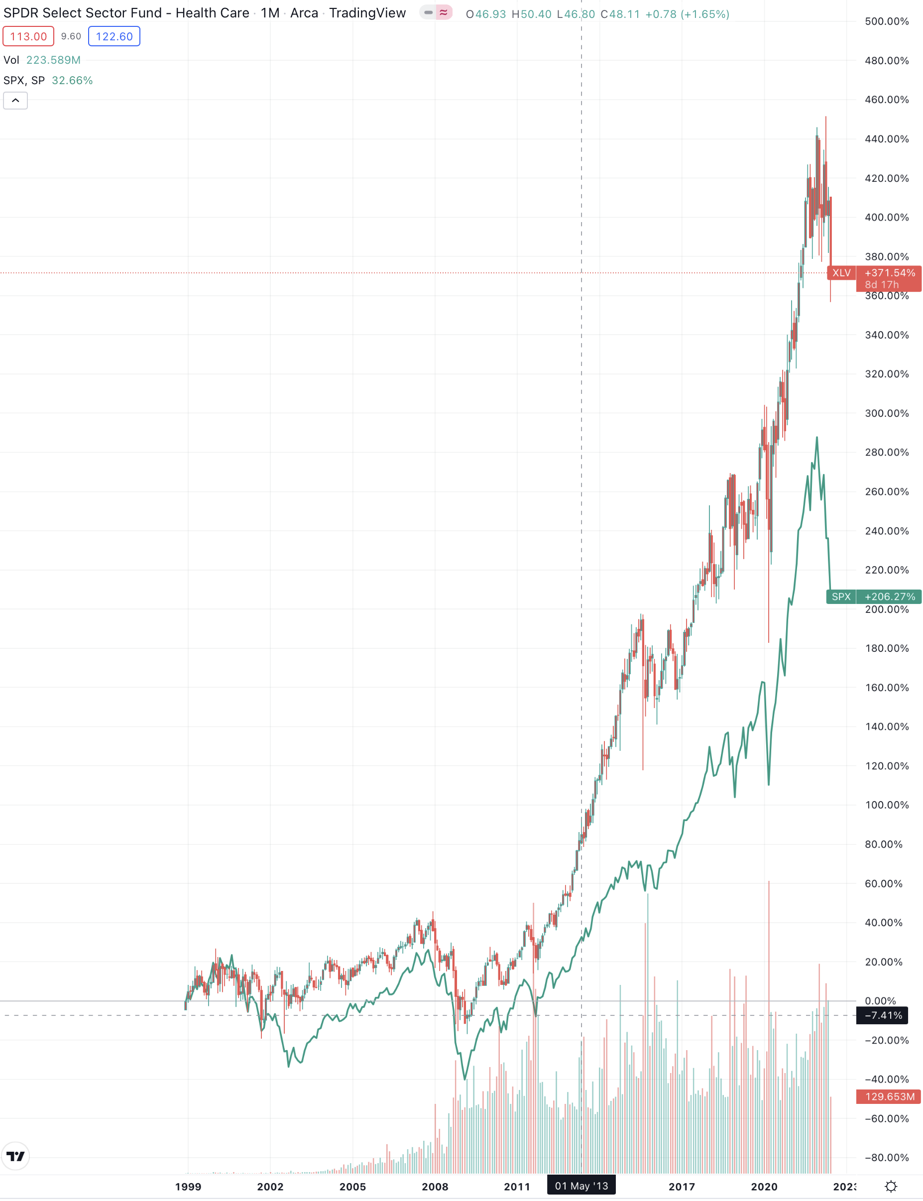 XLV가 출시된 1998년 이후 S&P500과의 퍼포먼스를 비교해보면, XLV가 +371.54% 상승하는 동안, S&P500은 +206.27% 상승하는 데 그쳤습니다.
